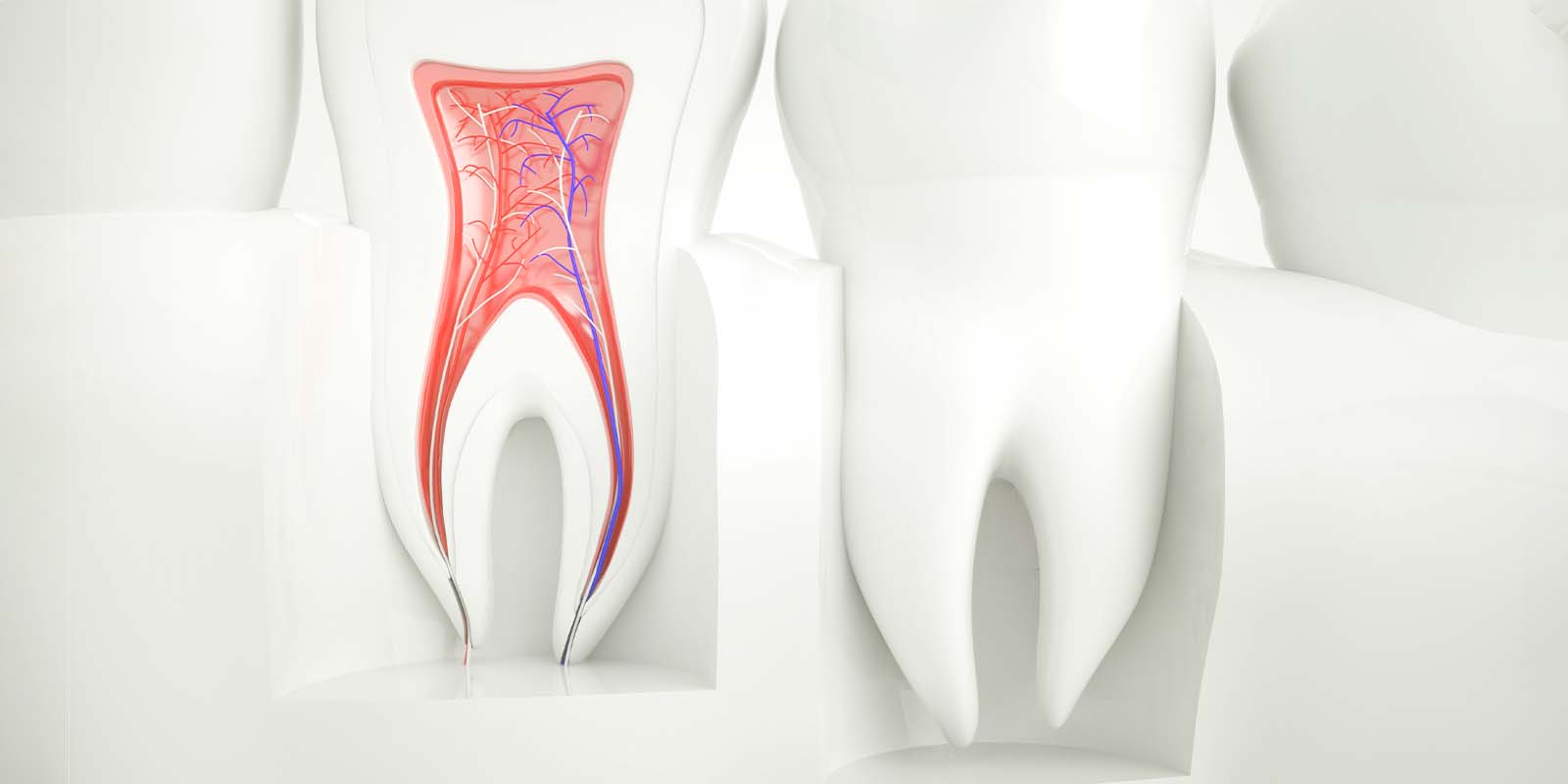 根管治療(根っこの治療)とは、虫歯が神経まで到達してしまった場合に、神経の通る管(根管)の神経を取り除いて、根っこをキレイする治療の事です。歯根治療とも呼ばれます。虫歯を放置すると、やがて細菌が出す毒素や細菌自体が歯の内部にある歯の神経(歯髄)まで到達し、いわゆる虫歯の激痛を引き起こします。 また症状がさらに進みますと、歯に触れただけで痛んだり、腫れを伴うこととなります。